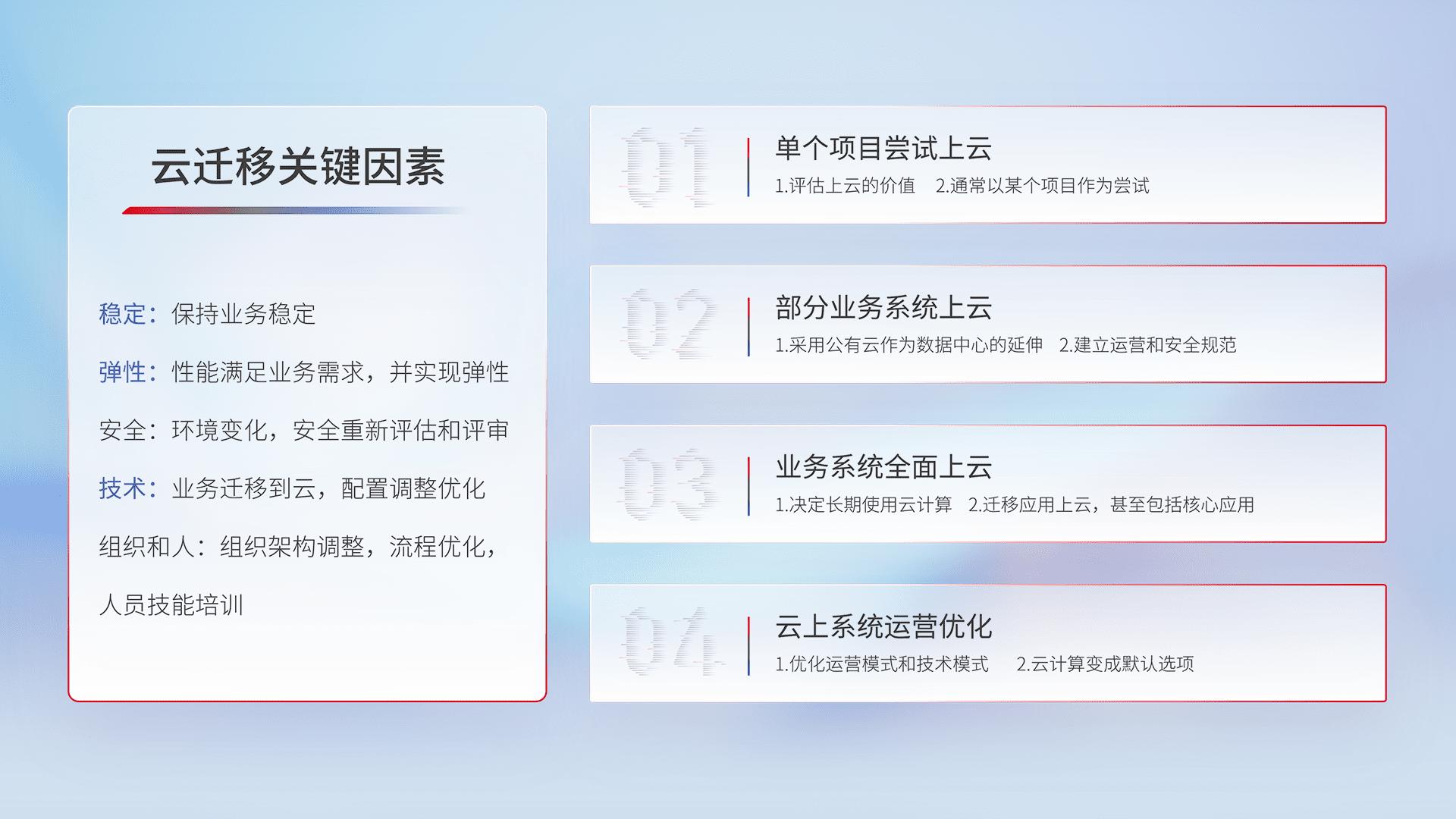 结合实际业务,,从规划设计、、云平台选型、、、云原生改造、、、数据迁移、、、、集成交付,,迁移全过程为客户识别最佳上云路径,,,,做好风险识别管理,,,设计网络架构、、身份权限、、、安全审计合规、、操作审计、、、日志审计、、监控告警策略、、、、多站点容灾设计等,,对云上基础设施进行整体规划,,,,提升IT治理水平,,,以满足弹性、、、、高可用、、、、高性能的需求。。。