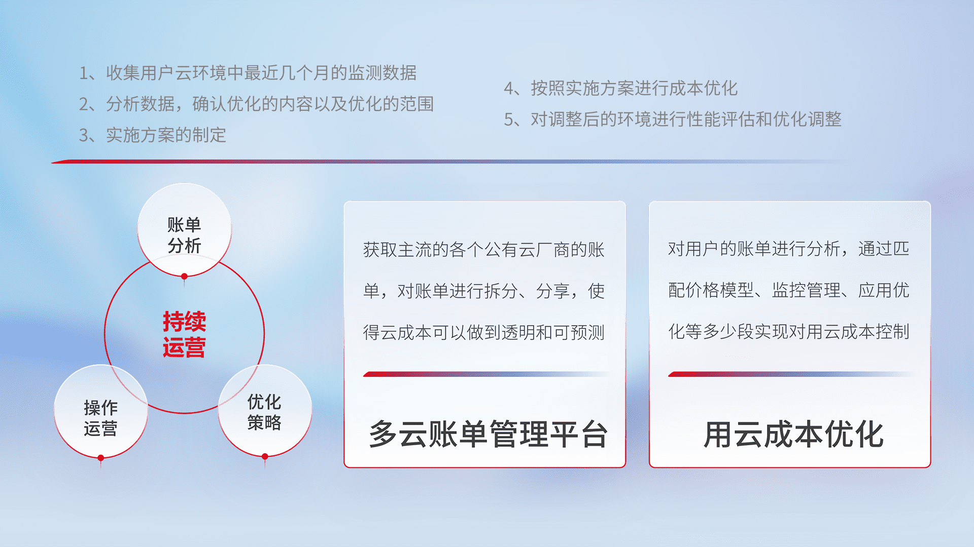 通过多云纳管,,,,以统一的资源数据模型把客户的云资源进行抽象和封装,,,进而实现对多云资源的统一操作,,,保障云资源管理的可靠性、、、稳定性与可用性。。量身定制化运维内容,,配置、、开发运维、、、补丁管理、、、、备份、、、监控、、、认证和访问管理、、审计和日常巡检等,,,保障在用云过程中的可靠度,,,,稳定度以及高可用率。。。。